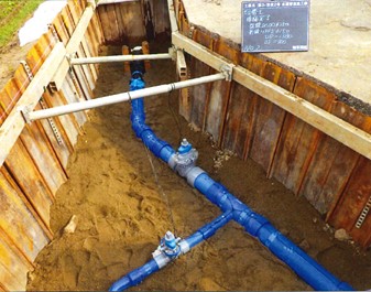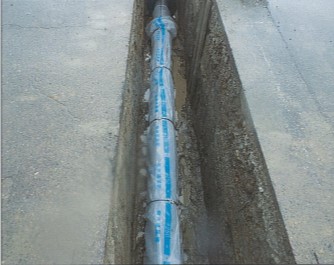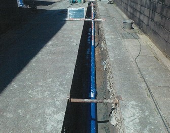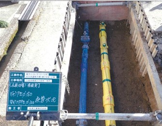 工事箇所は、主要地方道上越新井線の黒田交差点より東側から今泉スポーツ広場前の県道での工事であり、主に基幹管路となる水道管GX型ダクタイル鋳鉄管250mmの布設を行った。