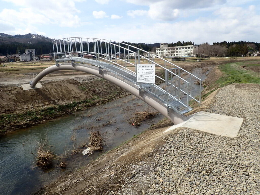 工事箇所は、主要地方道上越新井線の黒田交差点より西側の一級河川青田川の河川横断工事であり、主に水管橋SUS250Aの架設を行う工事であった。